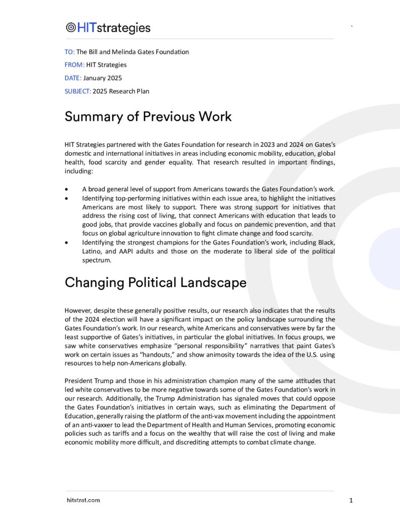 Our previous work with Gates shows that Americans generally support their work in each of the four main target areas: Economic Mobility, Education, Global Health, Global Agriculture/Climate.